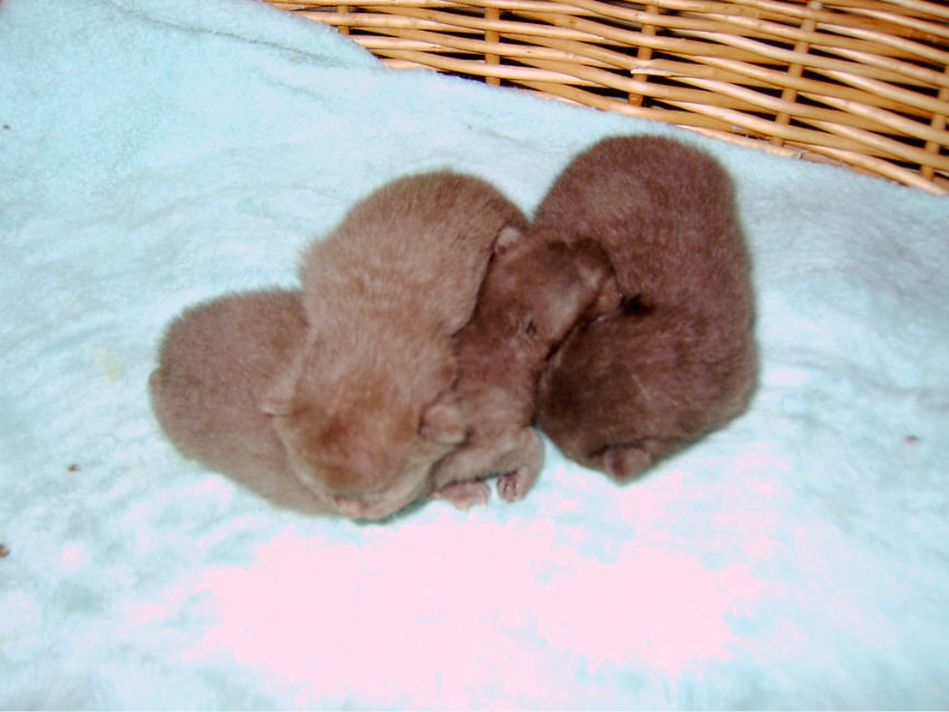 Leider starb der Lilackater einen Tag später. Durch die schwierige Geburt hatte er wohl einen Sauerstoffmangel im Gehirn und war geistig nicht in Ordnung. Die drei chocolate Mädchen aber haben sich prima entwickelt, und der Mama Iwana geht es auch gut. Amy kümmert sich vorbildlich um die drei Adoptivmädchen, und Yalinga muss sich nun zusätzlich um drei Kätzchen von ihrer Mama Amy kümmern. Aber sehen Sie selbst: (Es gibt auch Fotos bei "Jungtiere". ) Das waren die letzen Geburten in diesem Halbjahr. Ich habe aber die Erfahrung gemacht, dass die drei erlaubten Geburten in 2 Jahren optimal sind, ansonsten kommen die Mamas total aus dem biologischen Rhythmus. Und die beste Versorgung haben sie ja immer. Zwei sind ganz besonders hell. Alle sind durchgefärbt.