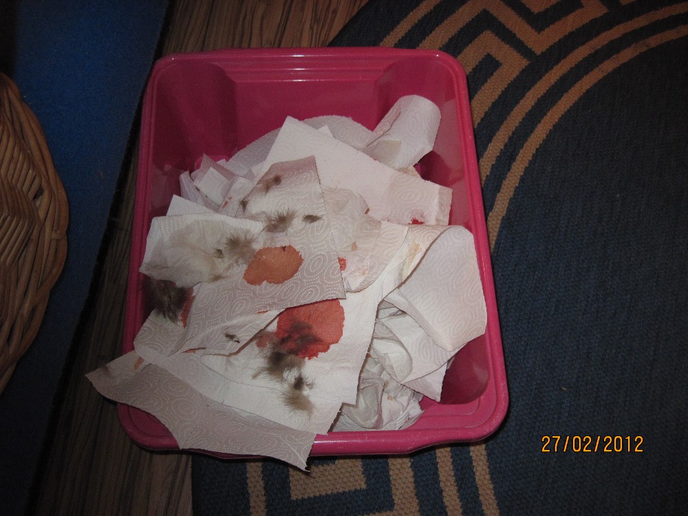 am Kopf und fahre sort mit Küchenrolle über Nase, Schnäuzchen,