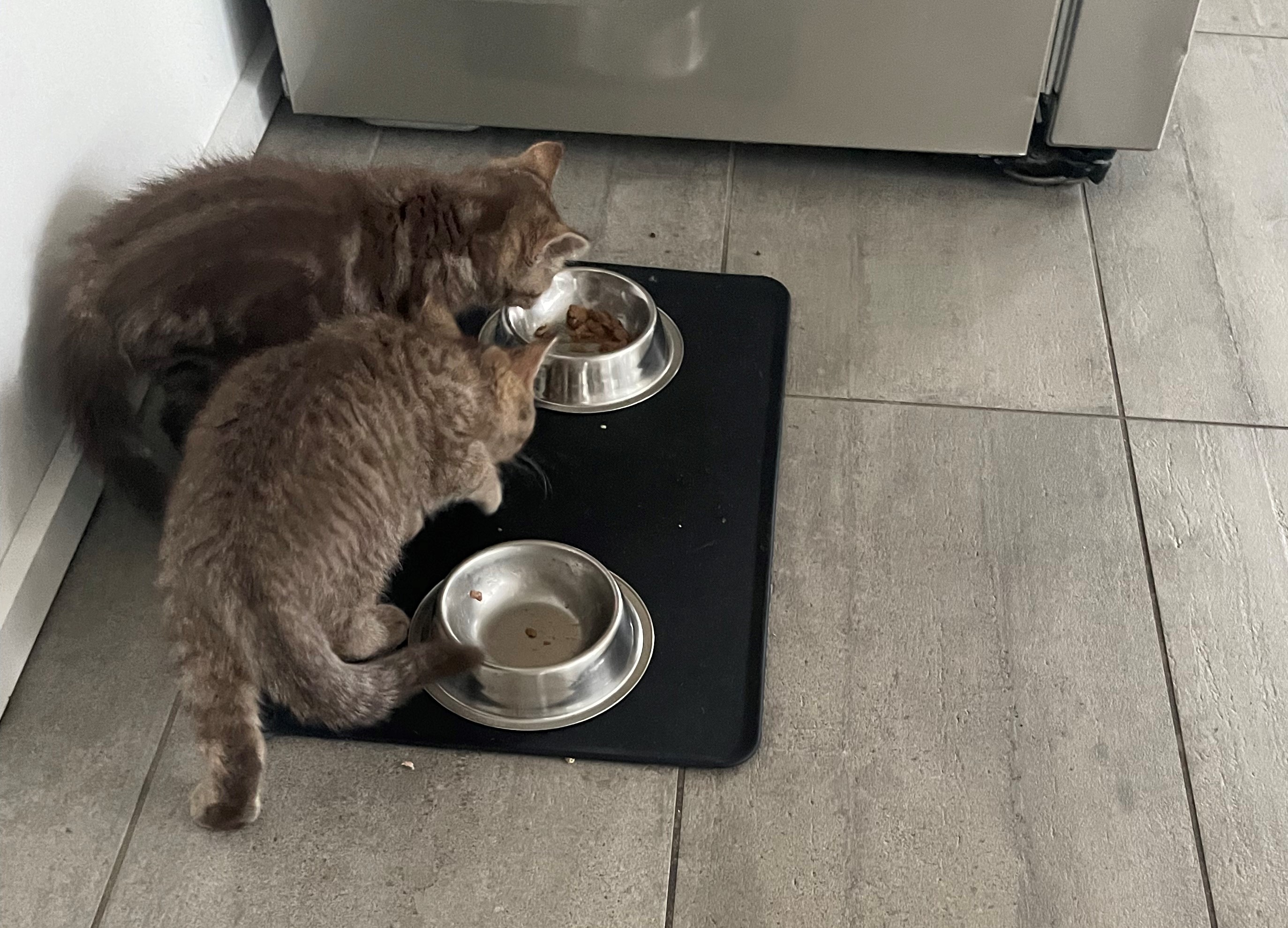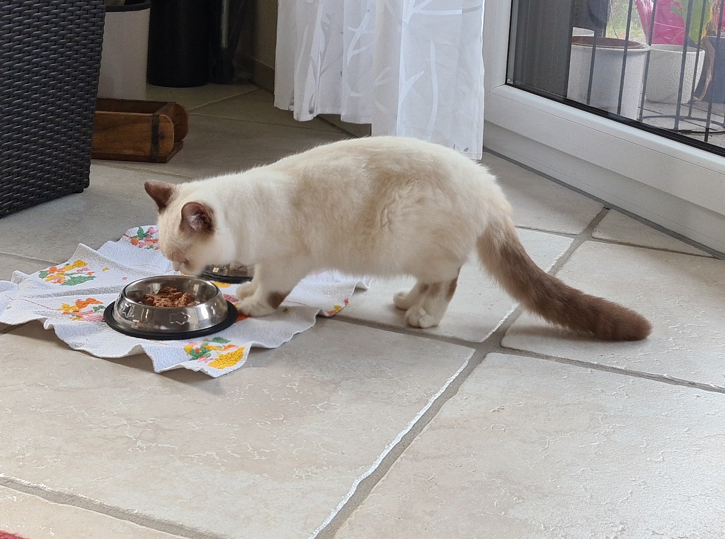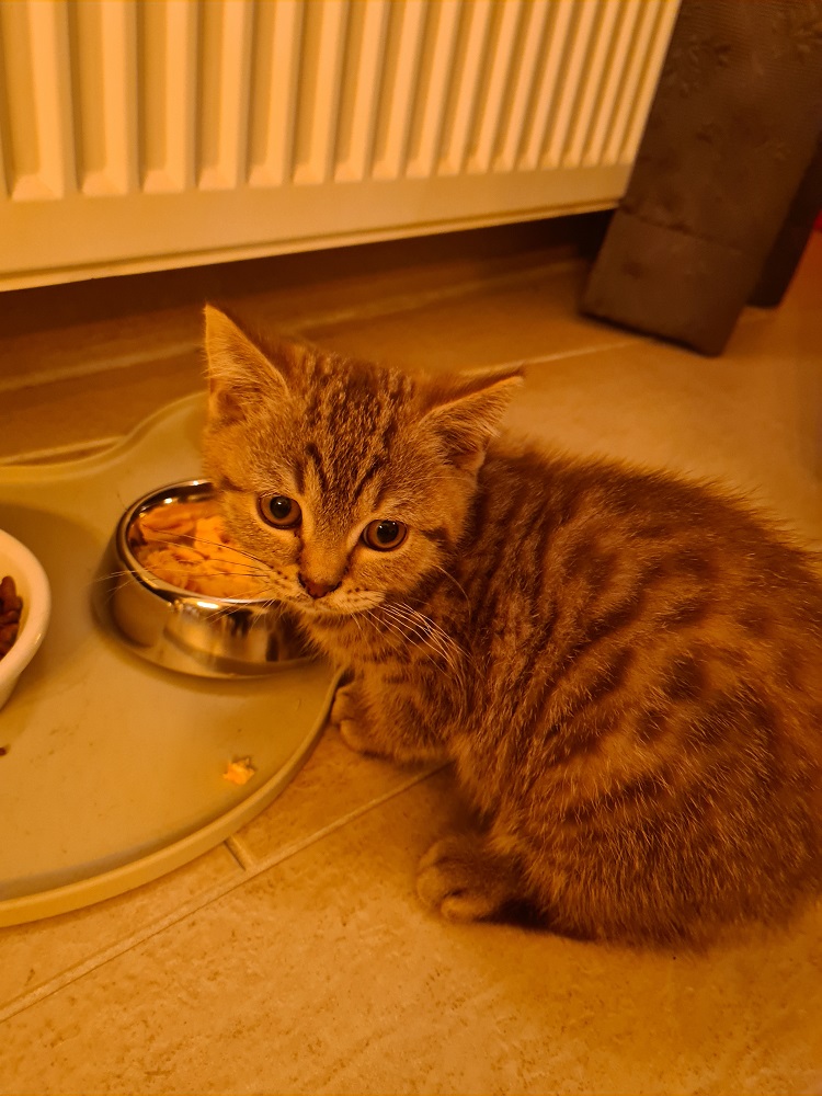 ihm Kittenfutter zu geben, aber er mag das Futter von Lucy lieber. Mittlerweile